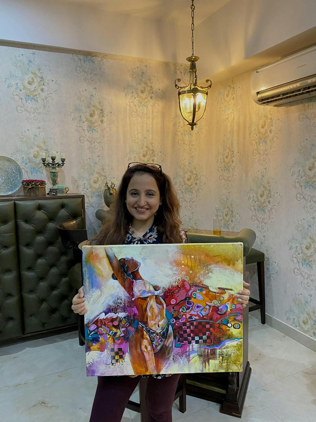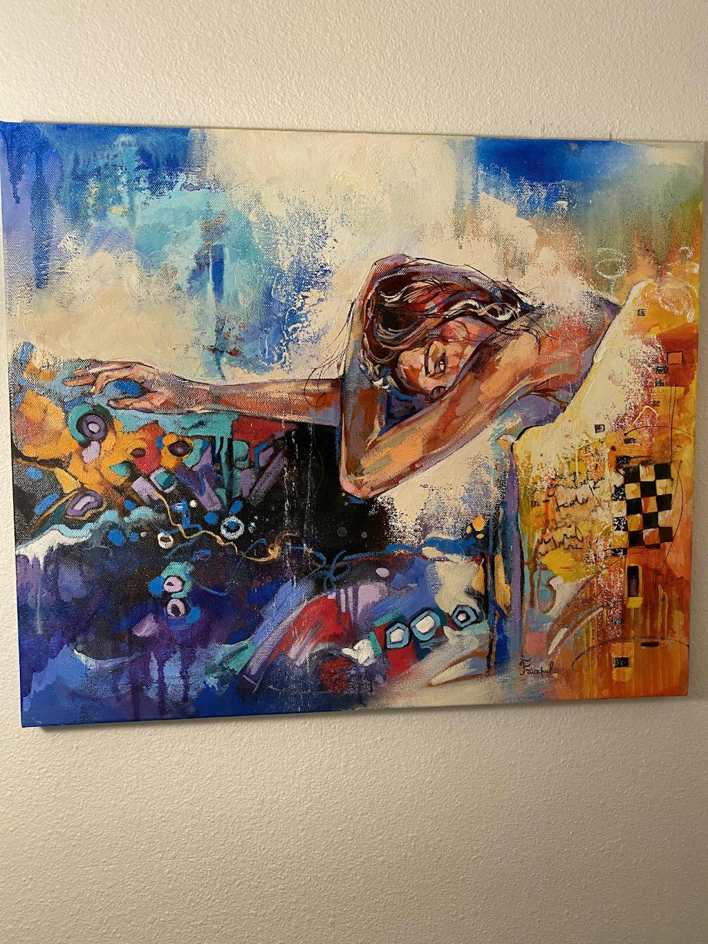 I am now the proud owner of a stunning abstract masterpiece by Esther Franchuk. The artwork caught my eye straight away. I had seen glimpses of it in numerous YouTube videos on Esthers channel, shown in exhibition spaces, with people viewing it, walking up close, and inspecting its details. When I discovered the artwork was for sale, I committed.