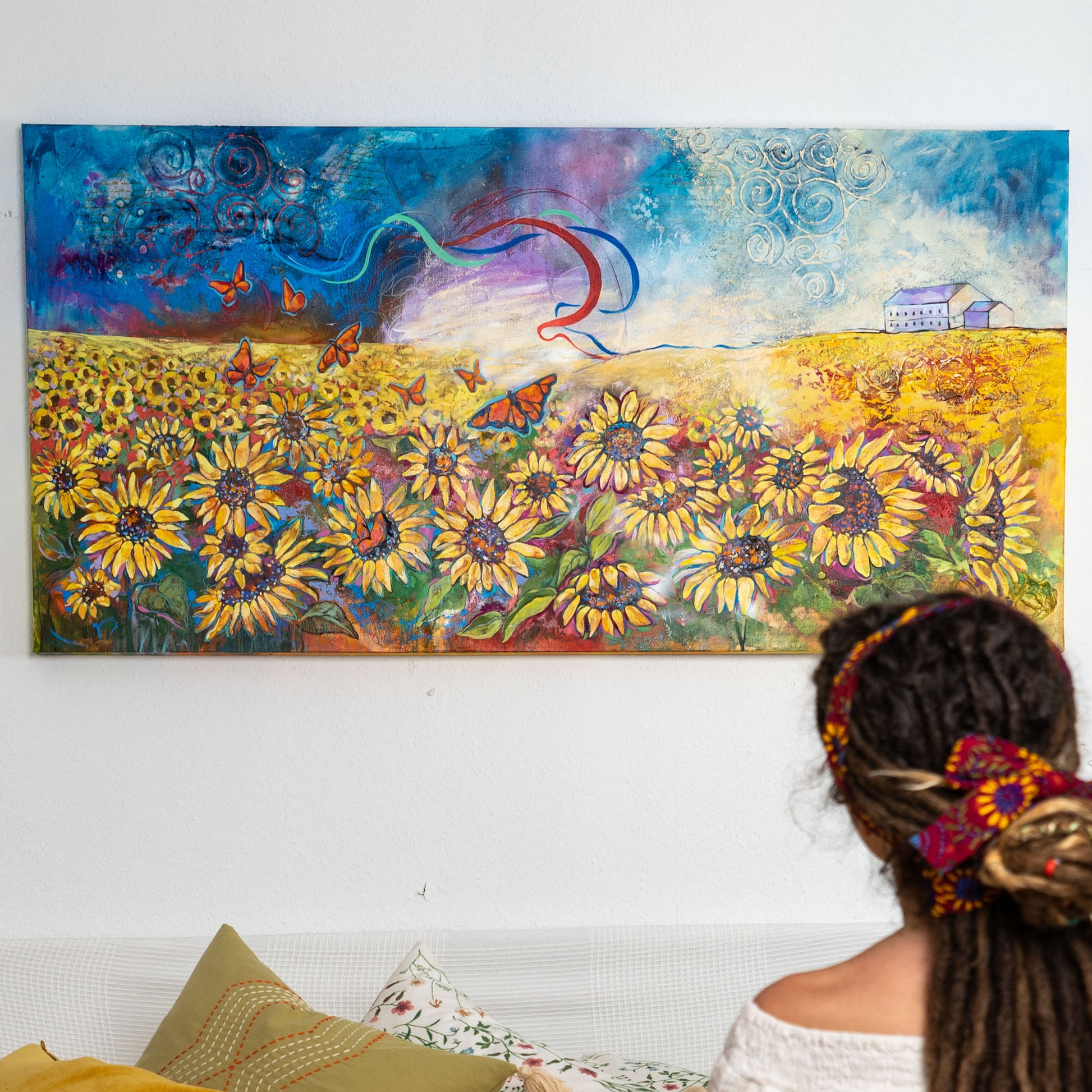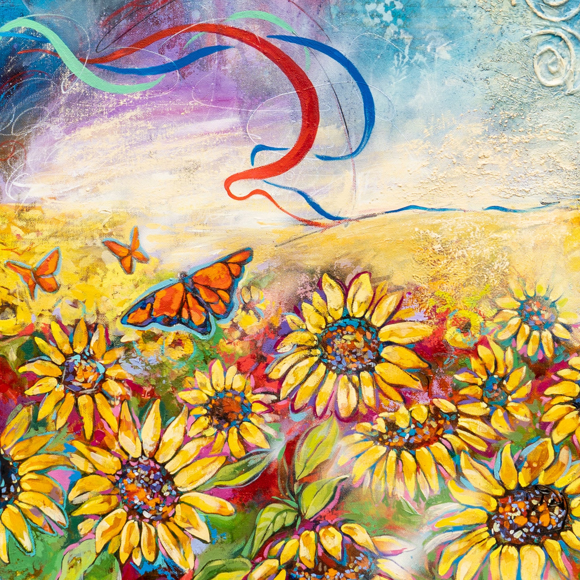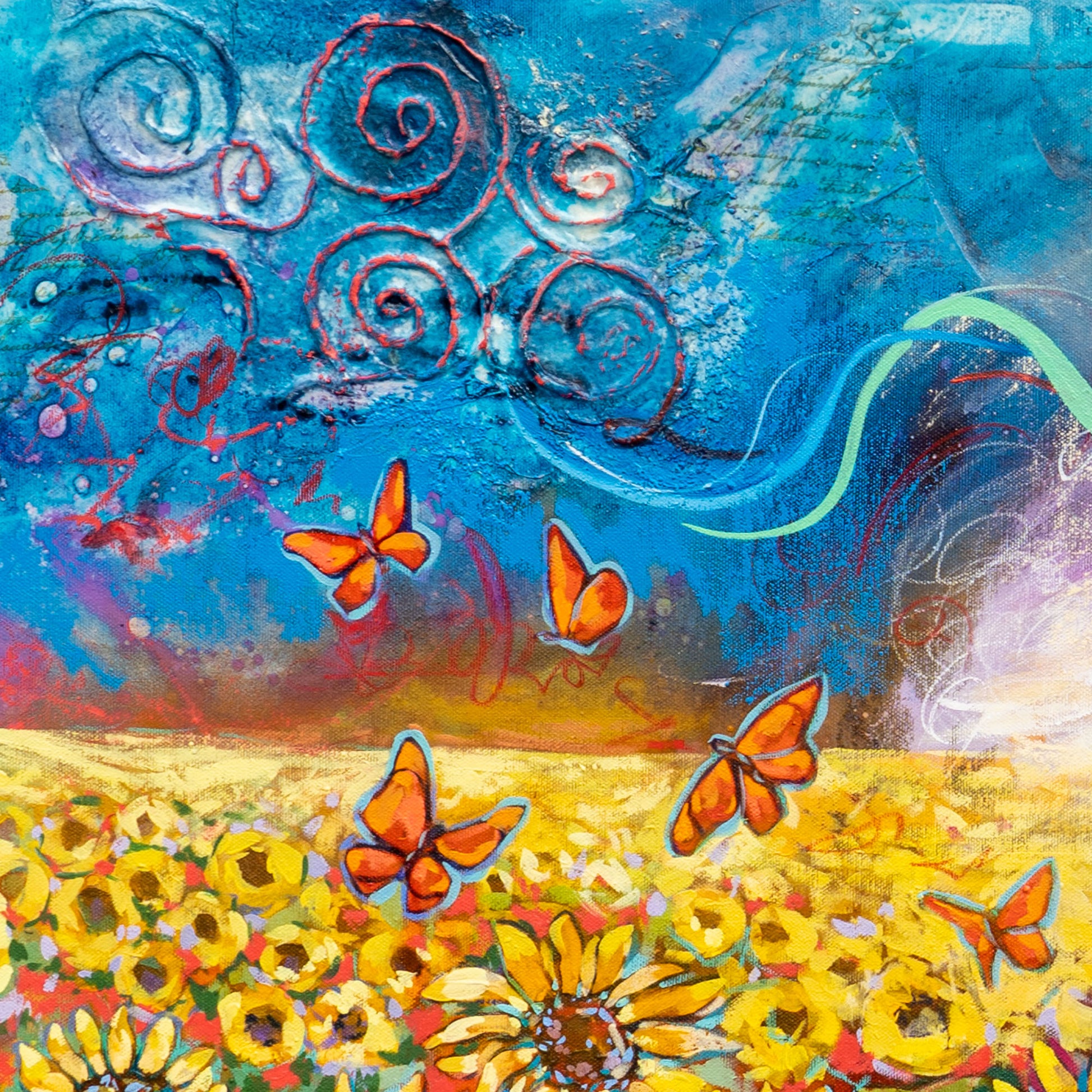 This piece is truly meaningful regarding my journey. You are a true inspiration for me. I can feel many emotions in this masterpiece! Butterflies are following the light, the sun, the positive energy! I love the way you paint your subjects, the way you include mixed media, the texture, etc... When I see your paintings, I see beauty, love, freedom and a huge feeling of serenity. Your art brings me peace into my heart anf heal my soul... many thanks Esther to do what you do. I can't wait to see more into your bright future! xx