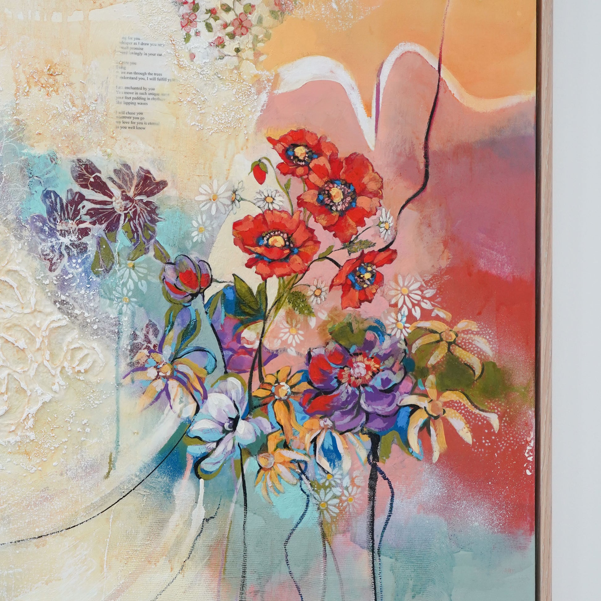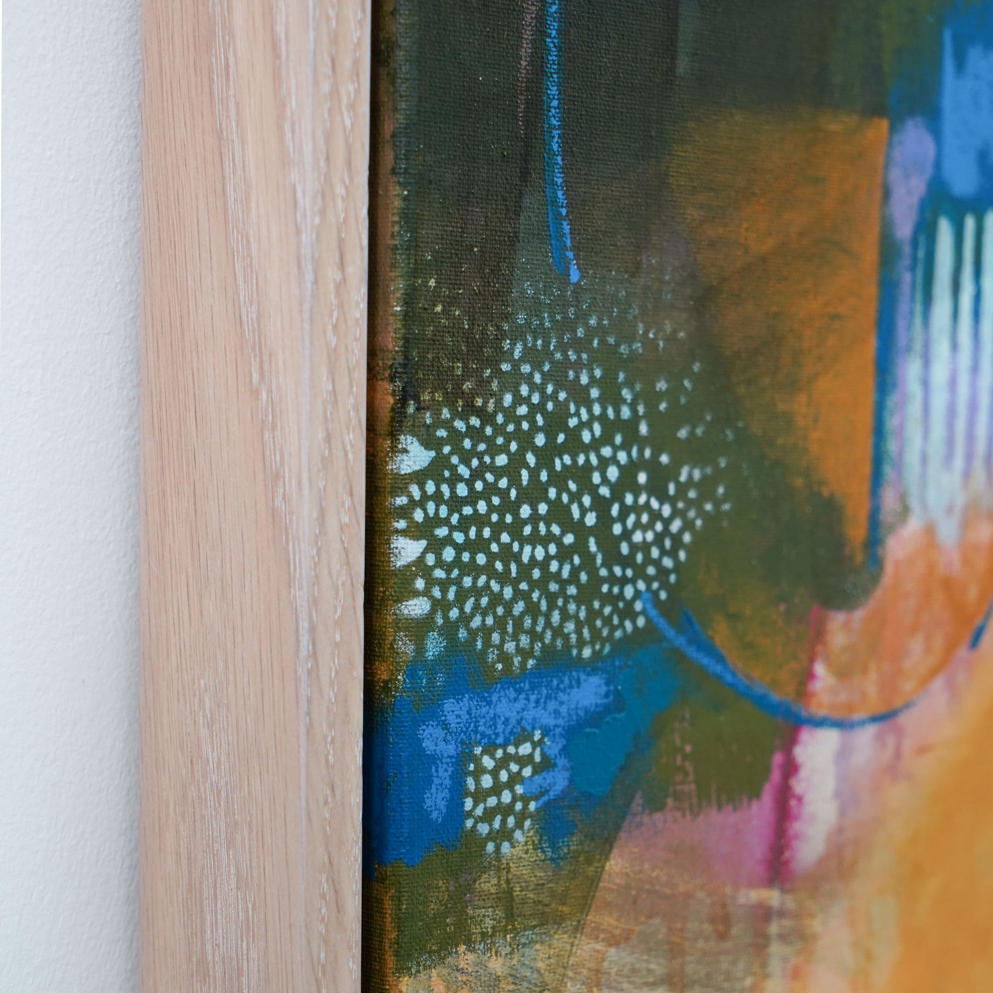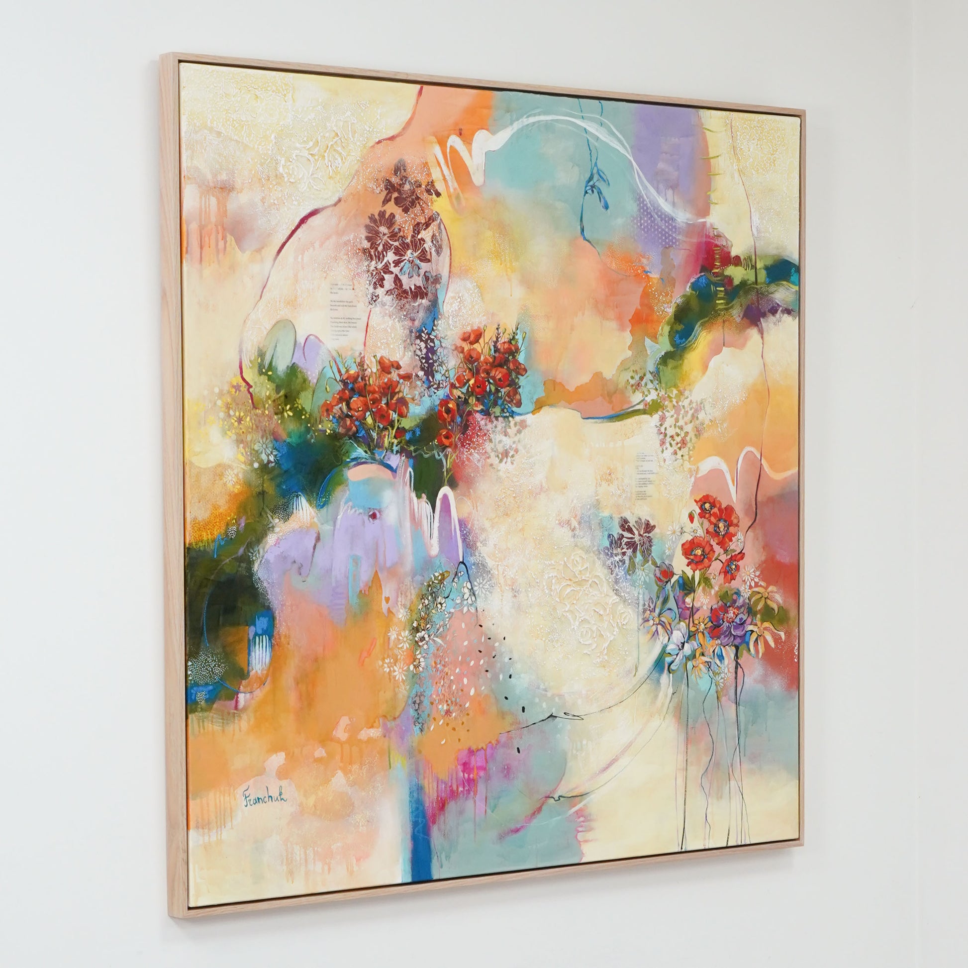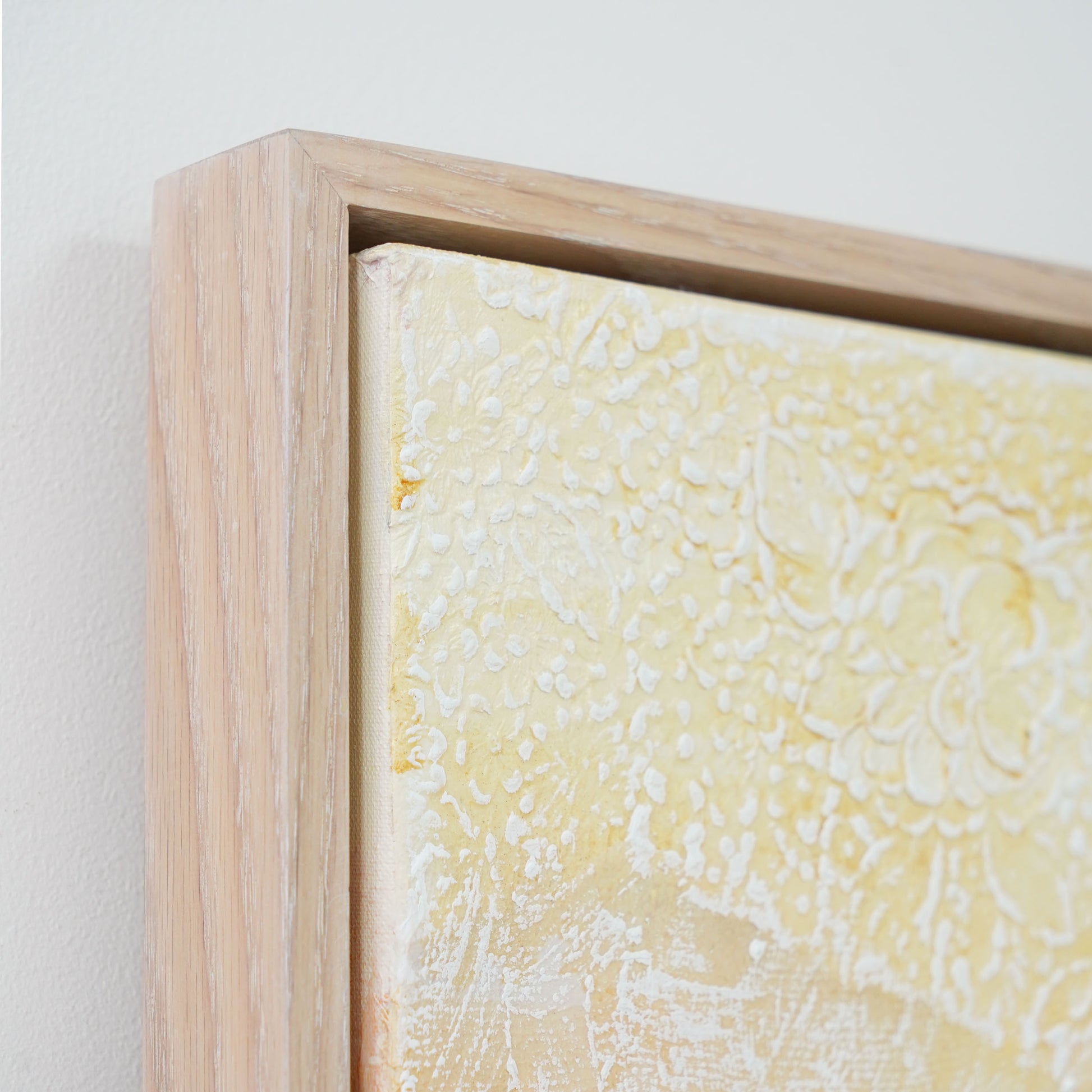 48 x 48" / 122 x 122cm Mixed Media Oil Painting on Gallery Wrapped Canvas, framed in white oak floater frame, 2025
