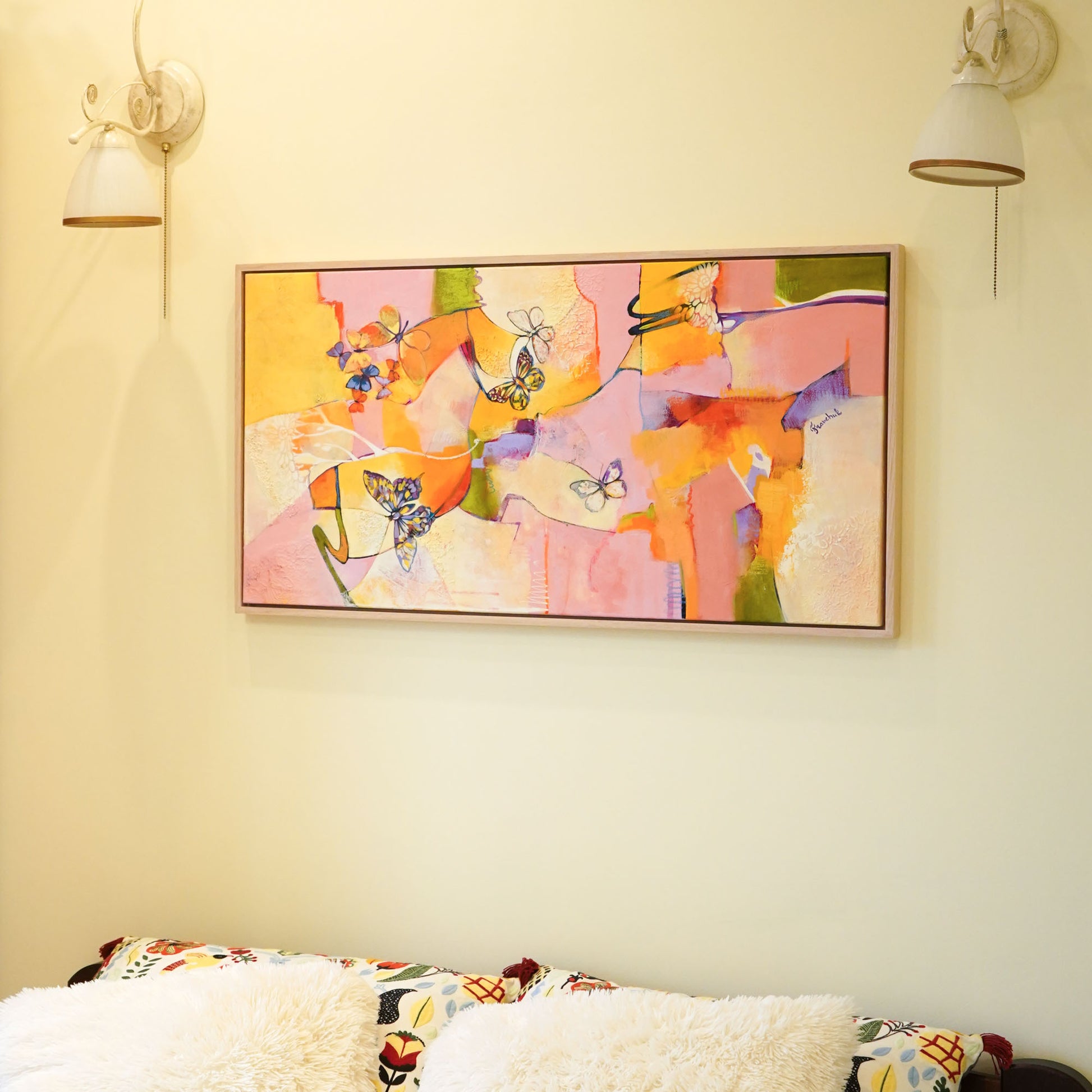 This painting means more than I can explain- after the death of my husband, I purchased a new, smaller, much less “grand” home. I’ve been working hard to make it feel like home, and when I saw this painting (coincidentally titled “Dwelling Place”), I knew it was just what I needed to complete my cozy entryway. The colors are happy, yet peaceful, and I love the way it greets me and everyone who walks through the door. I was impressed with the speed of delivery as well as the packaging of the painting. Esther also provided stretching/ framing advice, and the process was easier and less expensive than I’d anticipated. I am thrilled with every aspect of this purchase!