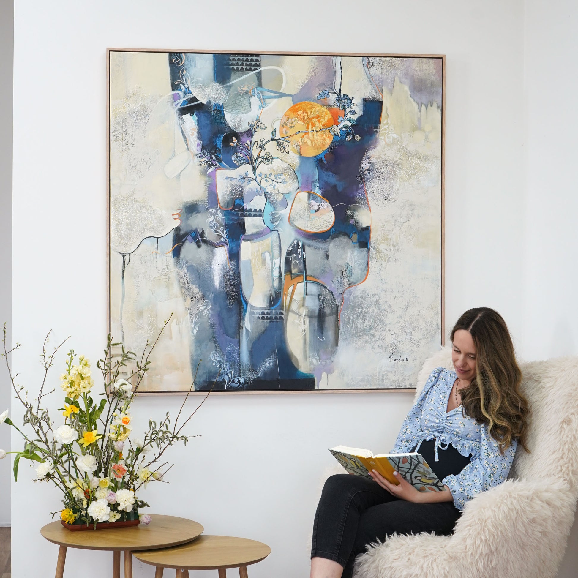 This painting means more than I can explain- after the death of my husband, I purchased a new, smaller, much less “grand” home. I’ve been working hard to make it feel like home, and when I saw this painting (coincidentally titled “Dwelling Place”), I knew it was just what I needed to complete my cozy entryway. The colors are happy, yet peaceful, and I love the way it greets me and everyone who walks through the door. I was impressed with the speed of delivery as well as the packaging of the painting. Esther also provided stretching/ framing advice, and the process was easier and less expensive than I’d anticipated. I am thrilled with every aspect of this purchase!