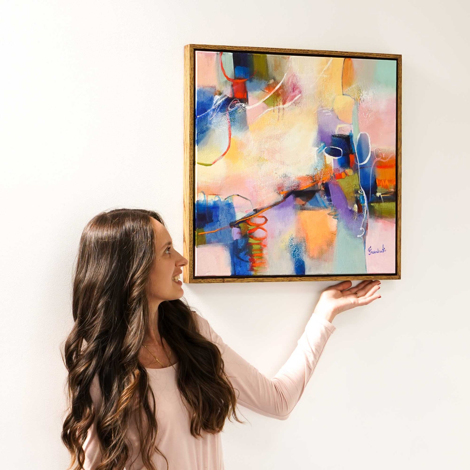 This painting means more than I can explain- after the death of my husband, I purchased a new, smaller, much less “grand” home. I’ve been working hard to make it feel like home, and when I saw this painting (coincidentally titled “Dwelling Place”), I knew it was just what I needed to complete my cozy entryway. The colors are happy, yet peaceful, and I love the way it greets me and everyone who walks through the door. I was impressed with the speed of delivery as well as the packaging of the painting. Esther also provided stretching/ framing advice, and the process was easier and less expensive than I’d anticipated. I am thrilled with every aspect of this purchase!