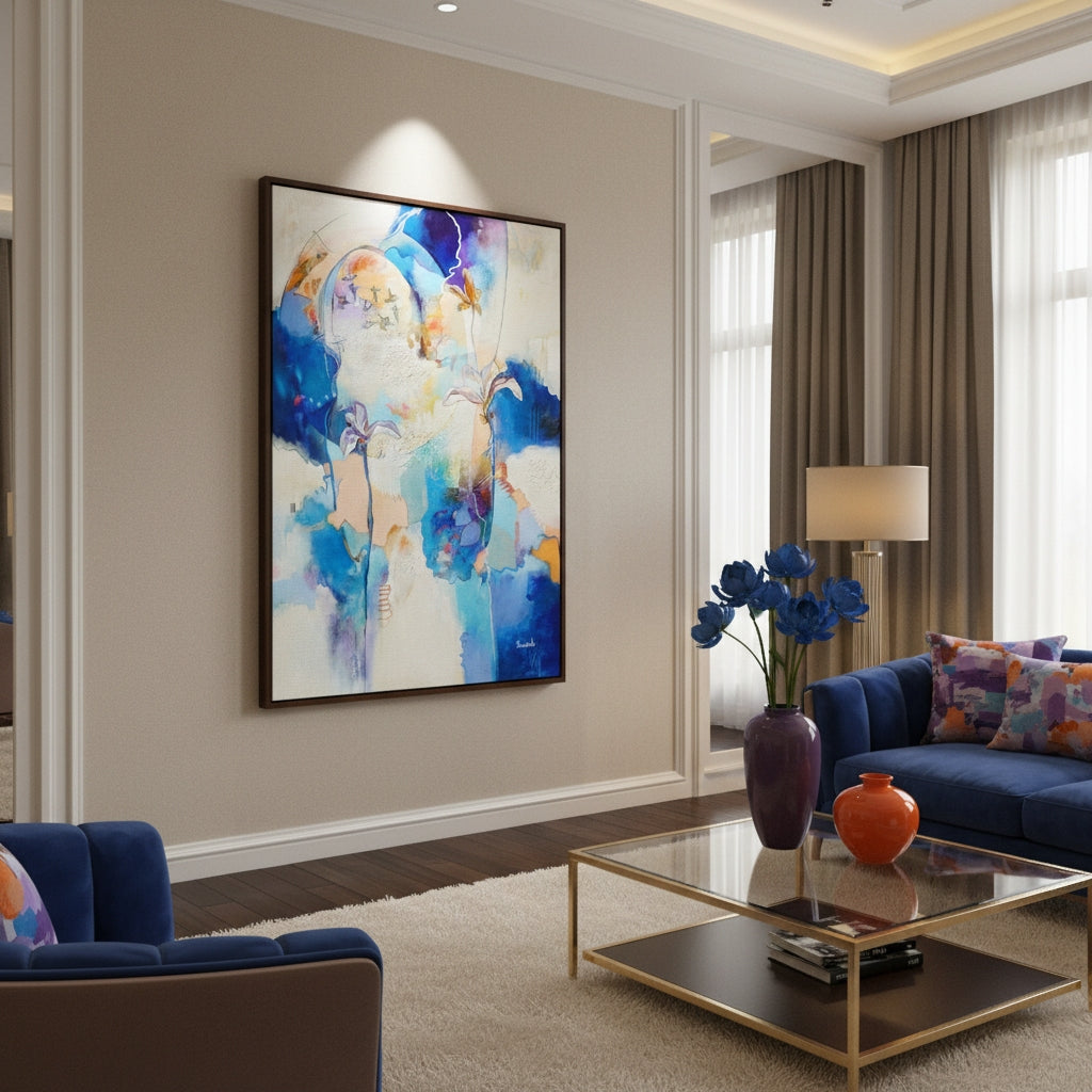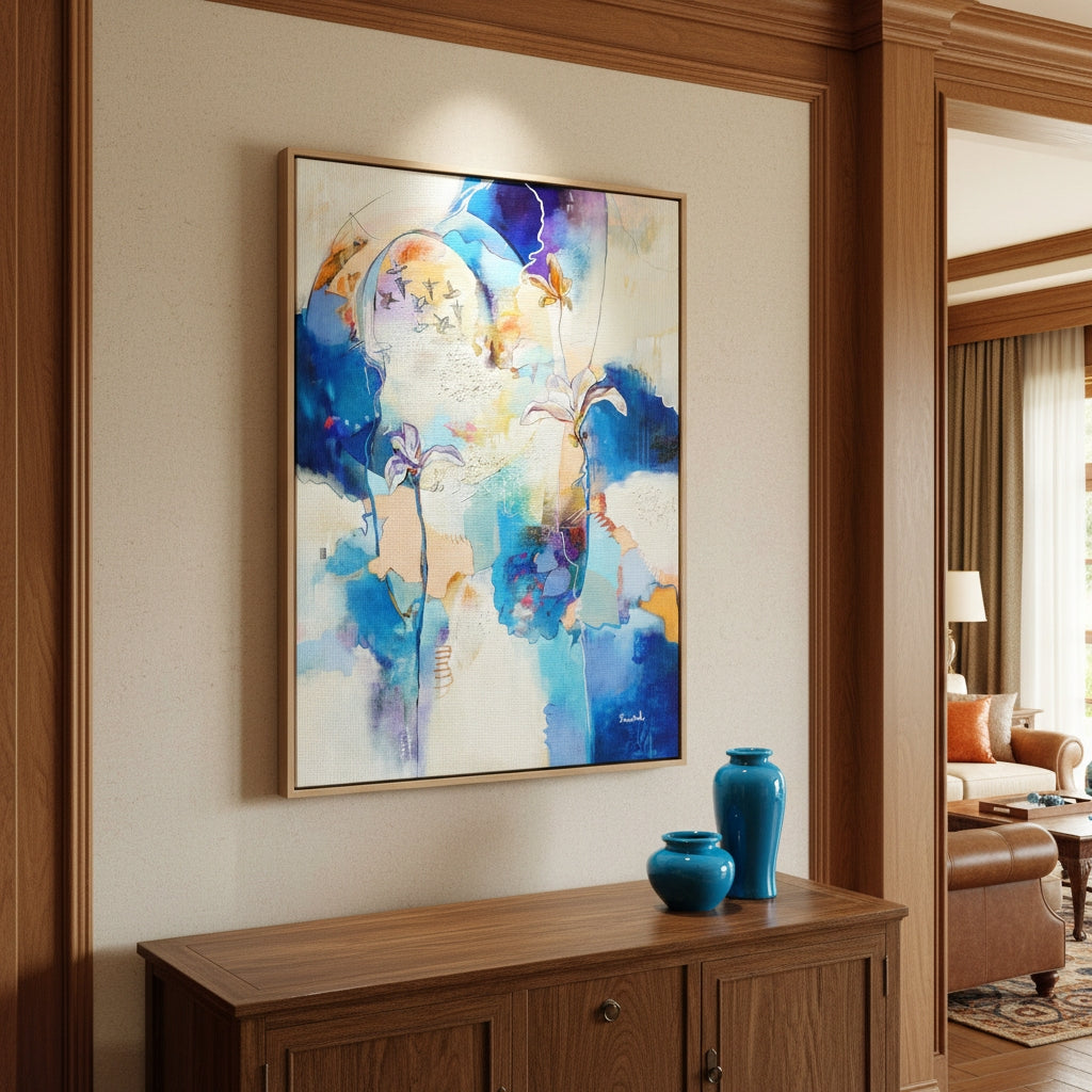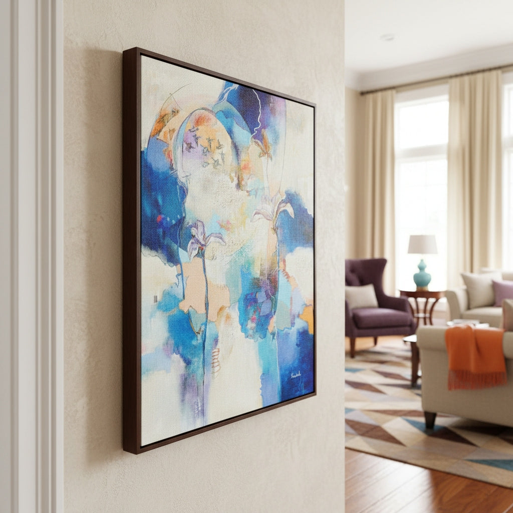 This painting means more than I can explain- after the death of my husband, I purchased a new, smaller, much less “grand” home. I’ve been working hard to make it feel like home, and when I saw this painting (coincidentally titled “Dwelling Place”), I knew it was just what I needed to complete my cozy entryway. The colors are happy, yet peaceful, and I love the way it greets me and everyone who walks through the door. I was impressed with the speed of delivery as well as the packaging of the painting. Esther also provided stretching/ framing advice, and the process was easier and less expensive than I’d anticipated. I am thrilled with every aspect of this purchase!