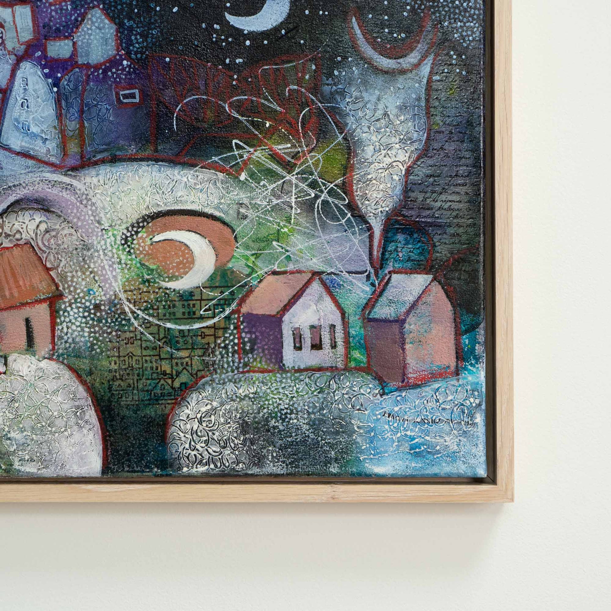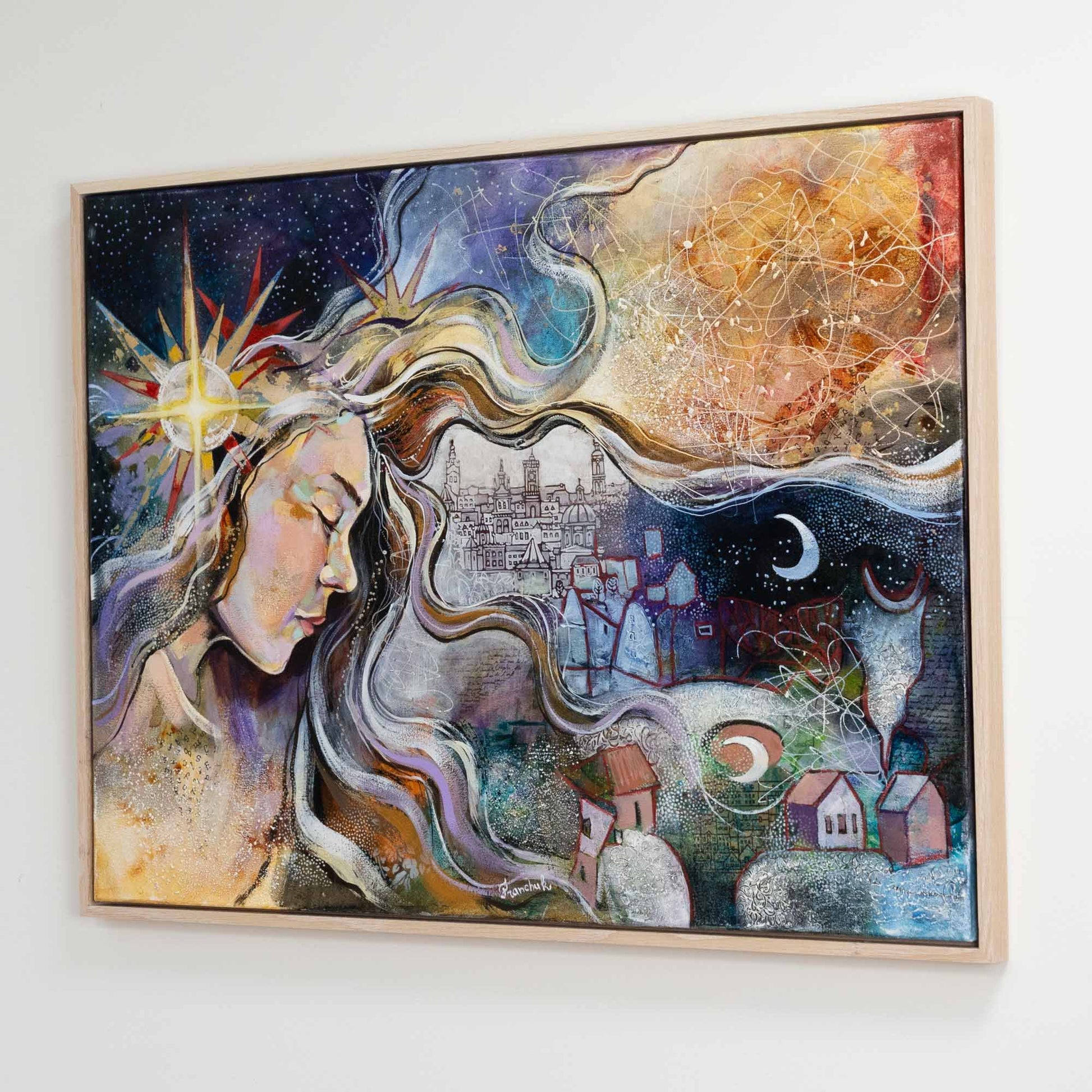 This painting means more than I can explain- after the death of my husband, I purchased a new, smaller, much less “grand” home. I’ve been working hard to make it feel like home, and when I saw this painting (coincidentally titled “Dwelling Place”), I knew it was just what I needed to complete my cozy entryway. The colors are happy, yet peaceful, and I love the way it greets me and everyone who walks through the door. I was impressed with the speed of delivery as well as the packaging of the painting. Esther also provided stretching/ framing advice, and the process was easier and less expensive than I’d anticipated. I am thrilled with every aspect of this purchase!